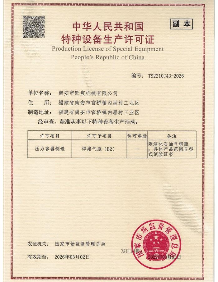 公司自2012年,專注液化石油氣鋼瓶生產,累積豐富特種設備制造經驗,并持二類壓力容器制造許可證(B2級),確保產品符合高標準。